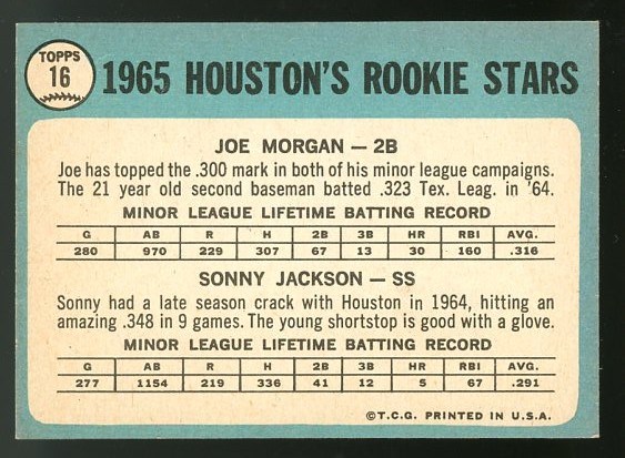 1965 Topps Joe Morgan RC #16 - Morgan is one of the key rookie cards in the 1965 Topps set. This card has nice centering, but does have a crease above "2nd Base." Overall VG. Minimum bid starts at just $20 for this HOF rookie card.