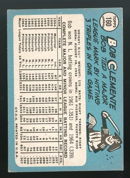 1965 Topps Roberto Clemente #160 - An attractive card of Clemente, this 1964 issue is crease free with wear in the lower right corner that contributes to the VG/EX grade.