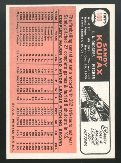 1966 Topps Sandy Koufax #100 - This would be Koufax's last regular issue Topps card.  The card is crease free with corner wear being the main contributor to the overall grade of VG/EX.