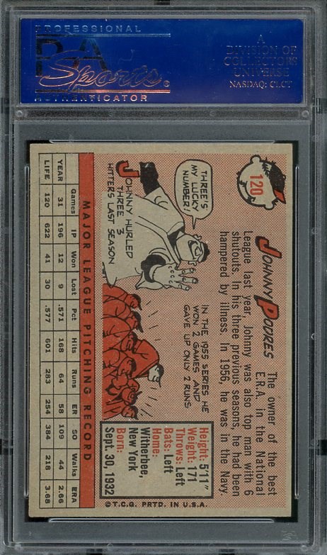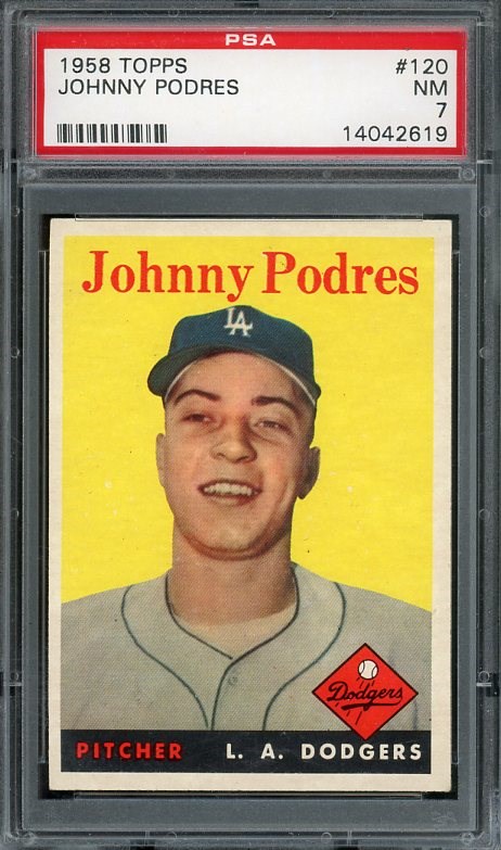 1958 Topps Johnny Podres #120  PSA NM 7 - A nice near mint card of Dodger great Johnny Podres.  Card comes in a scratch free PSA holder.