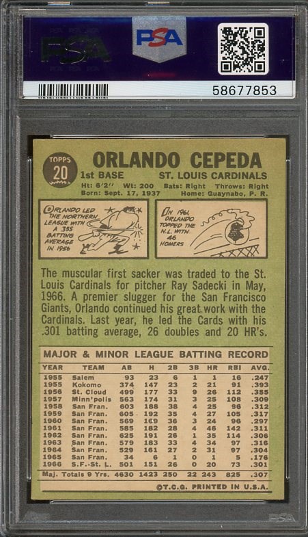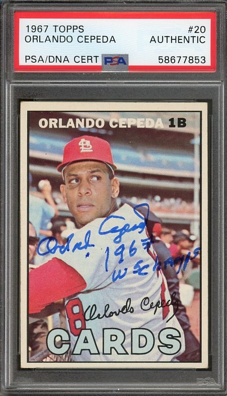 1967 Topps Orlando Cepeda #20 Autographed with Inscriptions PSA/DNA Authentic - HOFer Orlando Cepeda signed this 1967 Topps issue and added a "1967 WS Champs" inscription. Card is crease free and looks to be in EX condition.