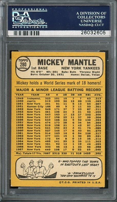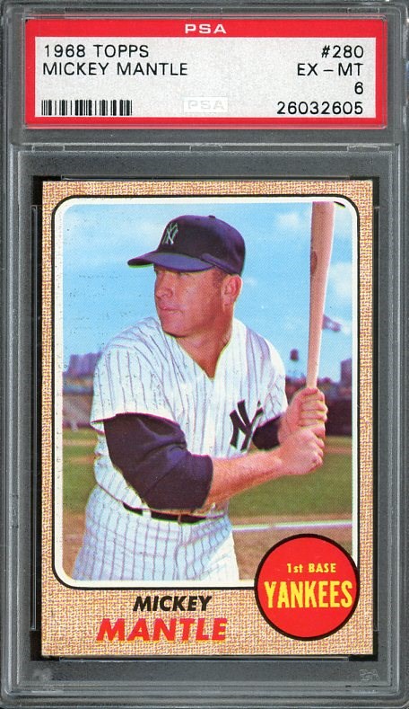 1968 Topps Mickey Mantle #280 PSA EX/MT 6 - This mid grade Mantle from 1968 ended up being the last season that he would play. Though Topps issued Mantle in the 1969 set, he did not play that year. He retired with 536 home runs.