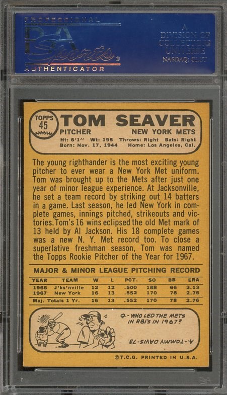 1968 Topps Tom Seaver #45 PSA NM 7 - This is Seaver's first solo card and features the Topps All-Star Rookie award. Seaver was a twelve time All-Star, won three Cy Young awards and finished with 311 wins.