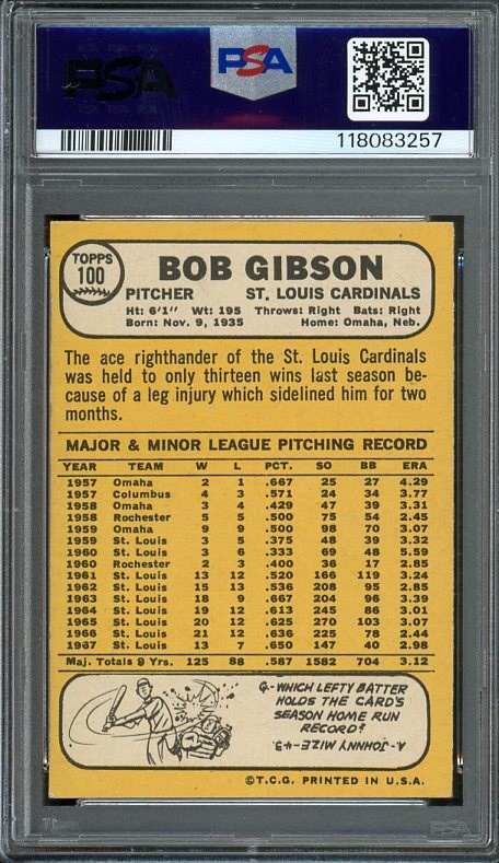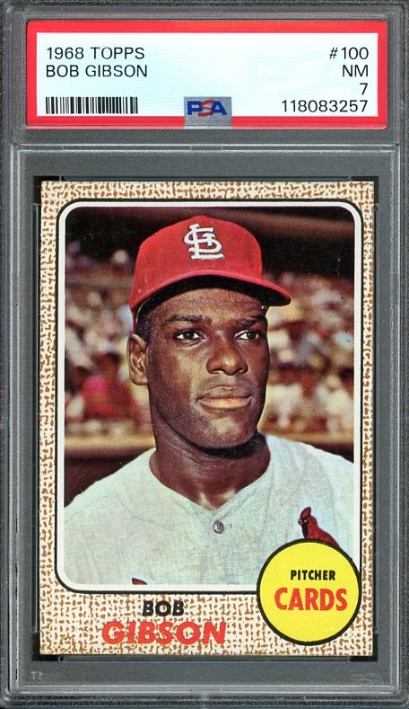 1968 Topps Bob Gibson #100 PSA NM 7 - Gibson was a member of the Harlem Globetrotters before signing a contract to play with the Cardinals. At the time of his retirement, Gibson ranked 2nd on the all-time strikeout list.