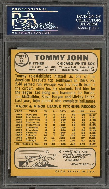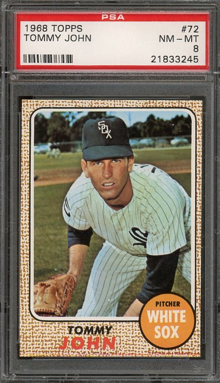 1968 Topps Tommy John #72  PSA NM/MT 8 - A pack fresh card with original color and great centering.  Excluding Roger Clemens, Tommy John has the highest win total (288) that is is not in the Hall of fame.
