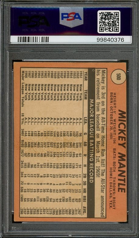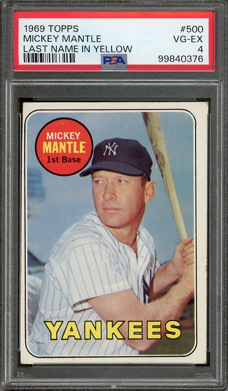 1969 Topps Mickey Mantle #500 (Yellow Letter)  PSA VG/EX 4 - Card is crease free with centering and corner wear contributing to the VG/EX grade.  Card comes in a new PSA holder.