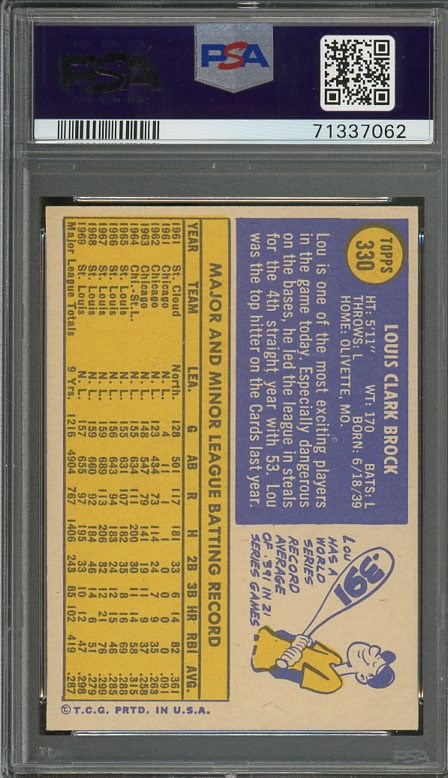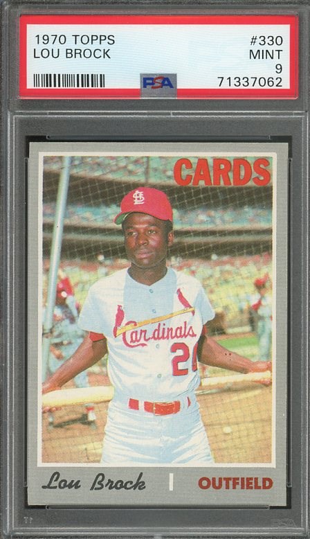 1970 Topps Lou Brock #330  PSA MINT 9 - PSA 9's prior to the 1980's have been red hot over the last year.  Be sure and add some to your collection before they all dry up.  Card comes in a scratch free holder.