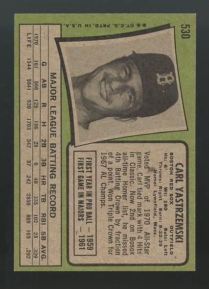 1971 Topps Carl Yastrzemski #530 - Card is crease free with a touch of corner wear and top to bottom centering contributing to the EX grade.