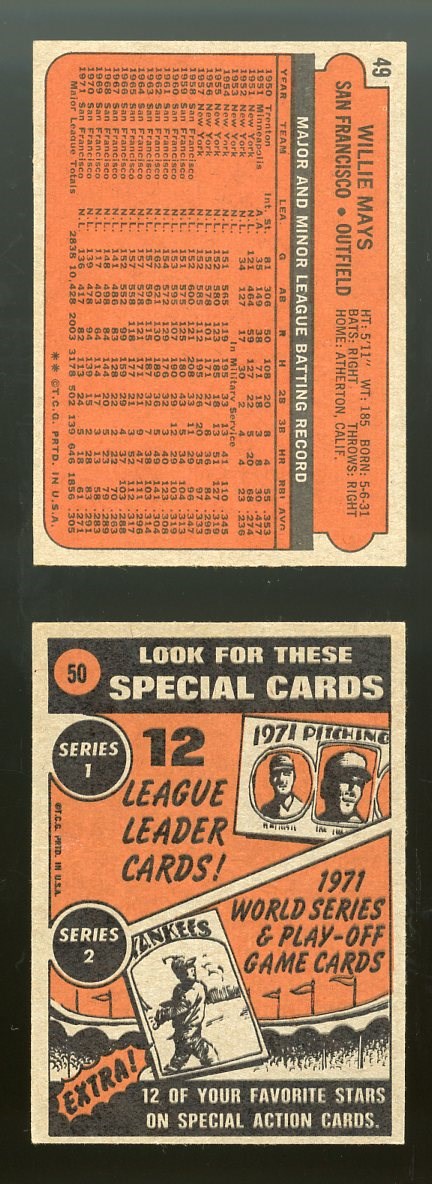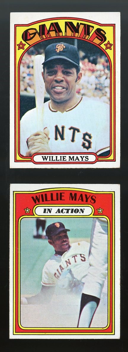 1972 Topps Willie Mays #49 and In Action #50 - The Mays card #49 is EX with only some corner wear holding it back from a higher grade. The In Action #50 is VG/EX with no creases.