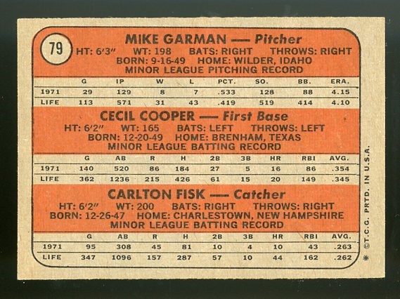 1972 Topps Carlton Fisk RC #79 - Card has nice centering and original color.  There are no creases, but there is some corner wear that results in an overall grade of EX.