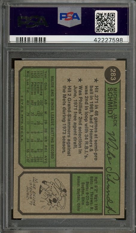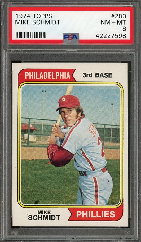 1974 Topps Mike Schmidt #283 PSA NM/MT 8 - Wow! Under magnification, this card has mint+ corners. There are two light print circles by "Philadelphia" that hold this back from a PSA 9 grade.