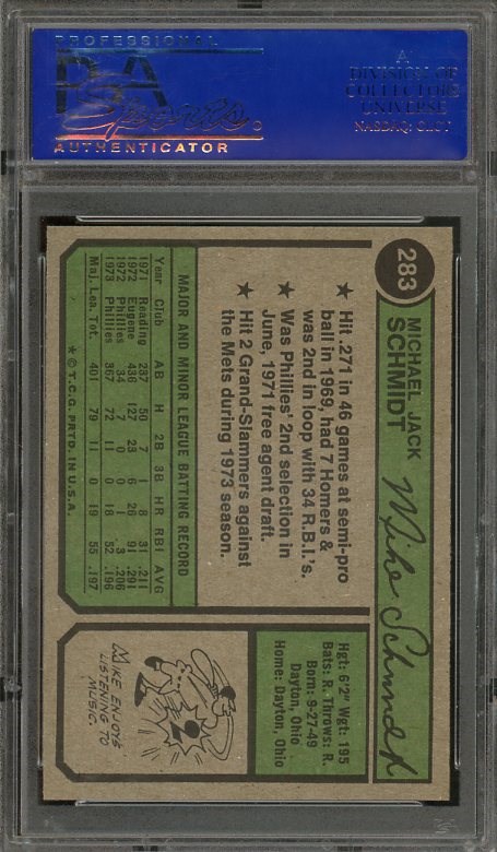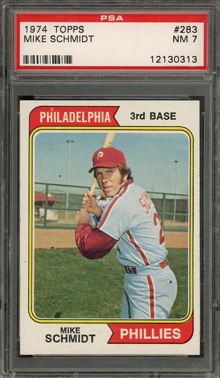 1974 Topps Mike Schmidt #283 PSA NM 7 - This is Schmidt's first solo Topps card and a key to the 1974 Topps set. Here is a near mint PSA 7 for your consideration.