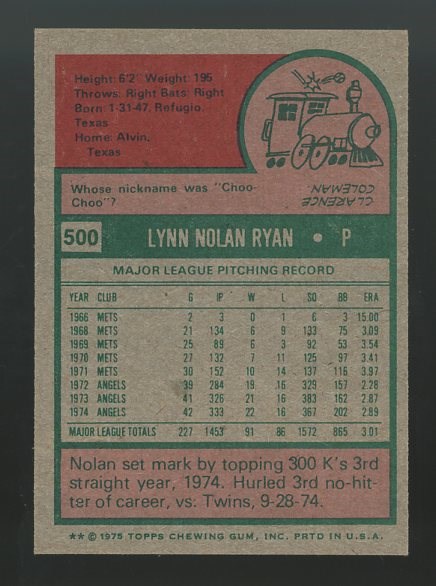 1975 Topps Nolan Ryan #500 - Card is crease free with 65/35 centering and strong color. Card has light corner wear which contributes to the overall grade of EX.