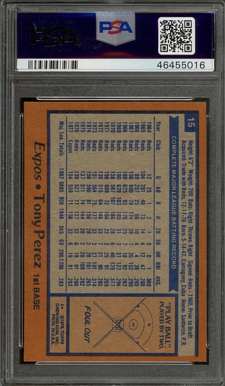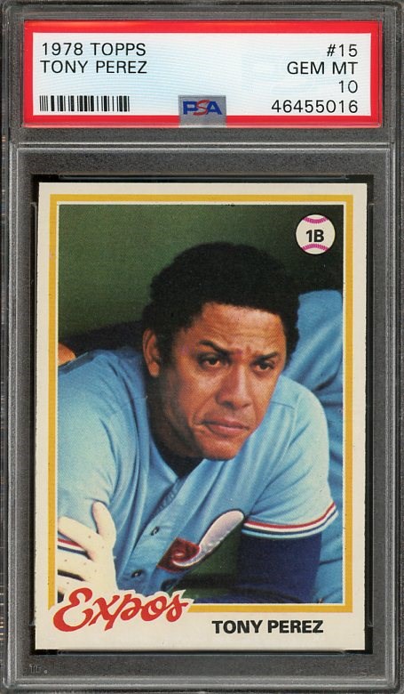 1978 Topps Tony Perez #15  PSA GEM MINT 10 - Gem Mint 10's from the 1970's are getting really hard to find.  Here is a PSA 10 of HOFer, Tony Perez.  Card comes in a scratch free PSA holder.