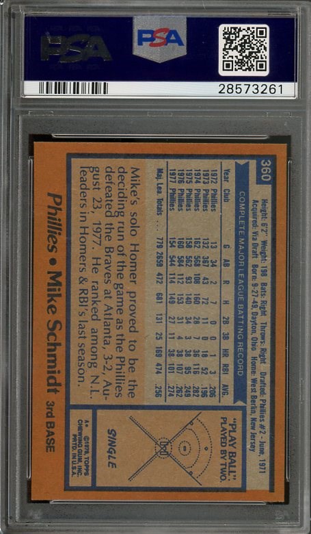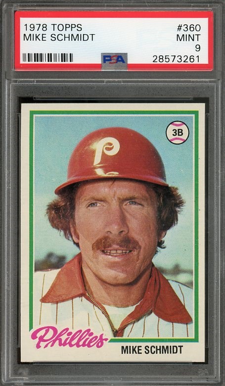 1978 Topps Mike Schmidt #360  PSA MINT 9 - Here is a great card of Mike Schmidt, when he was in the prime of his career.  Card is mint and the holder is scratch free.