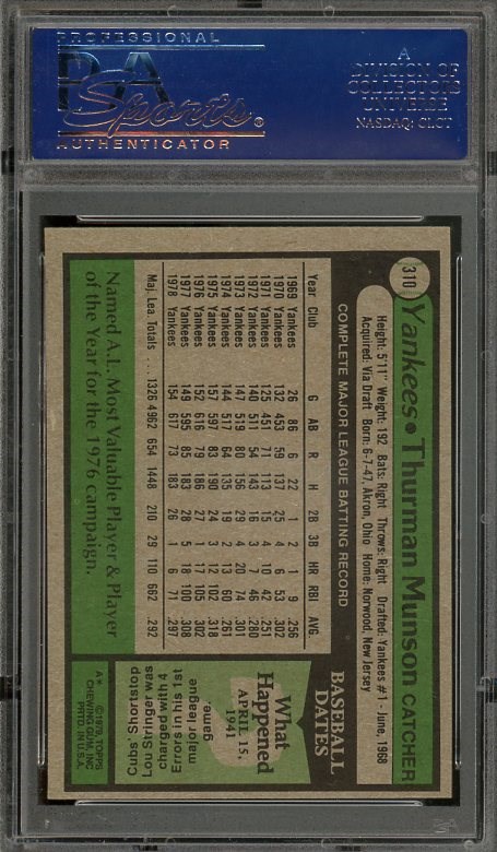 1979 Topps Thurman Munson #310  PSA MINT 9 - This would be Munson's last card, as he passed away at age 32.  The card in a solid PSA Mint 9 and comes in a scratch free holder.
