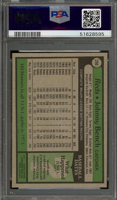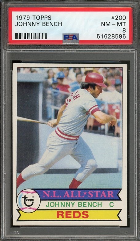 1979 Topps Johnny Bench #200  PSA NM/MT 8 - Here is Hall of Famer Johnny Bench in a PSA NM/MT 8, with a starting bid that is less than half the cost to get it graded!  A great value item.