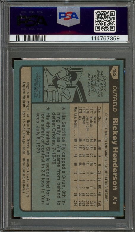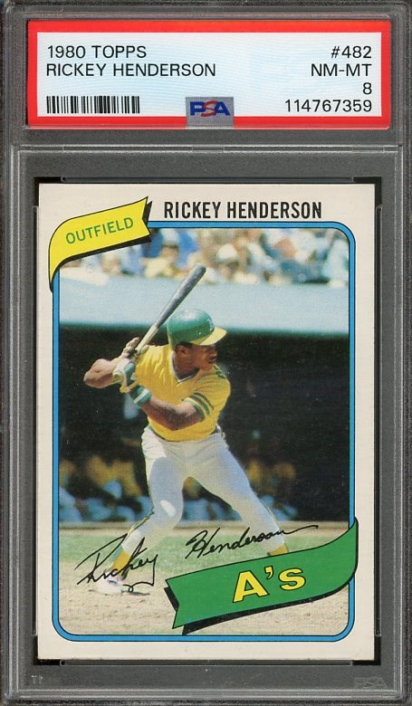 1980 Topps Rickey Henderson RC #482 PSA NM/MT 8 - Statistically one of the all-time greatest players, here is Rickey Henderson's rookie from the 1980 Topps set. Card has had great momentum recently.