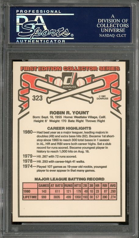 1981 Donruss Robin Yount #323 PSA GEM MINT 10 - PSA 10's on 1981 Donruss have come to life in the last six months. Collector's are realizing that the poor quality by Donruss their first year, makes for scarce PSA 10's.