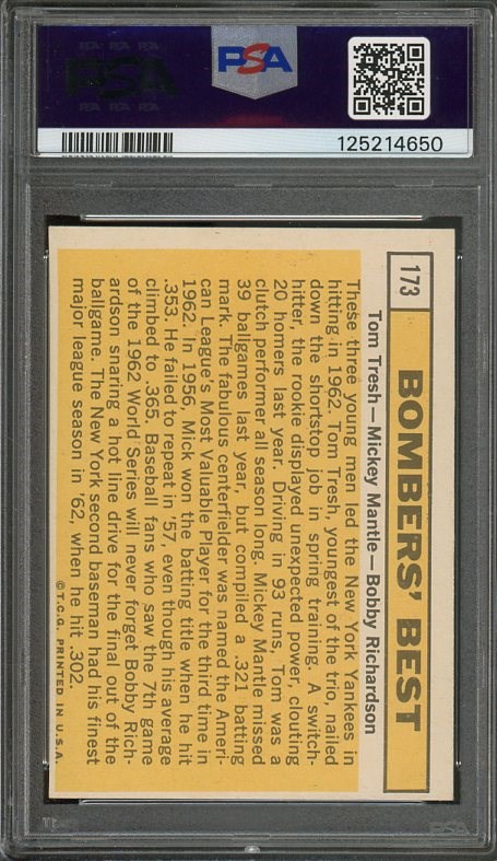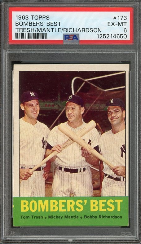 1963 Topps Bombers' Best #173 (Mickey Mantle) PSA EX/MT 6 - Here is one of the more affordable Mantle cards from the 1960's. The card has original color and nice corners, showing just a slight touch of wear.