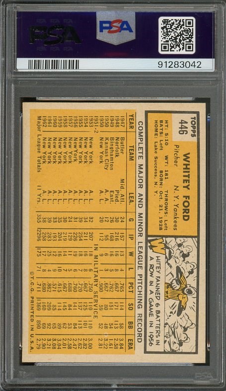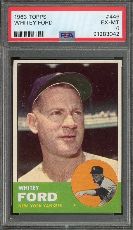 1963 Topps Whitey Ford #446 PSA EX/MT 6 - Ford was a six time World Series champion and a ten time All-Star. He won more than twice as many games as he lost going 236-106 lifetime. Card comes in a scratch free PSA holder.