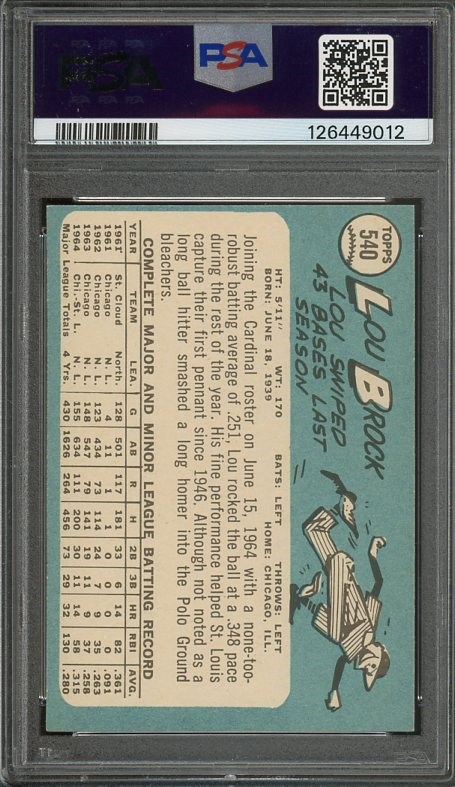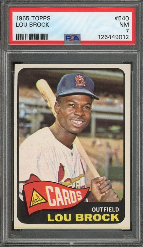 1965 Topps Lou Brock #540  PSA NM 7 - Up for auction is a nice 1965 Topps Brock card in near mint condition.  The card was recently graded and comes in a new PSA holder.