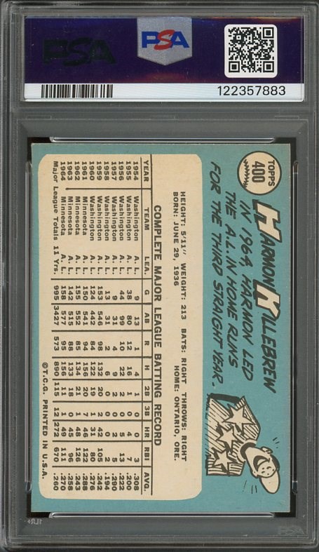1965 Topps Harmon Killebrew #400 PSA NM 7 - A solid near mint card with near perfect registration and original color. This Killebrew would go well in a high grade 1965 set. Comes in a new PSA holder.