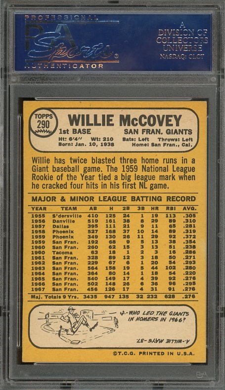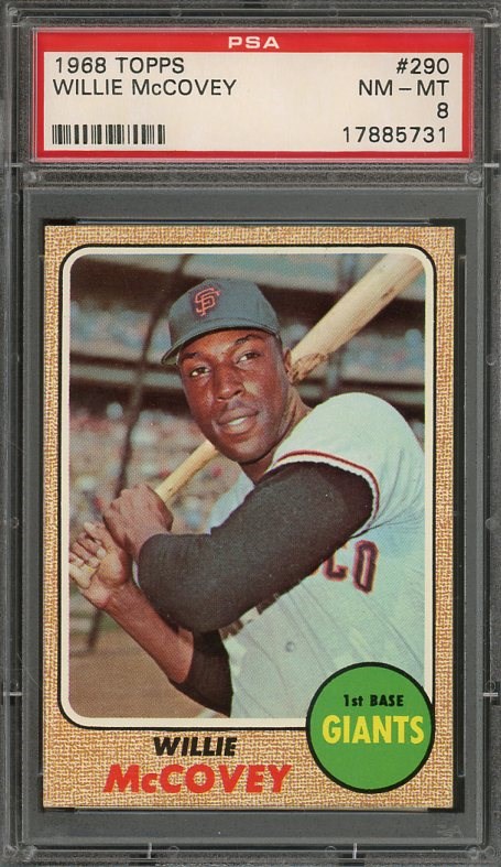 1968 Topps Willie McCovey #290 PSA NM/MT 8 - Great centering highlights this PSA NM/MT 8 McCovey card. For several years, McCovey was overshadowed playing with Willie Mays. By the end of his career he was second to only Babe Ruth for career homers my a left hander.