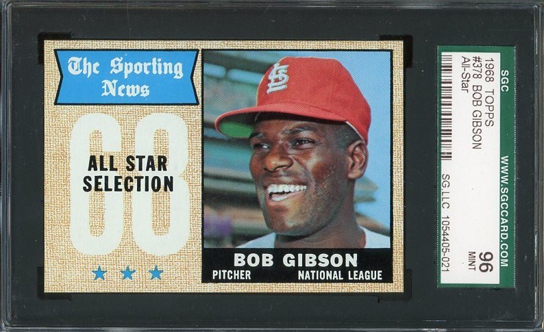 1968 Topps Bob Gibson All-Star #378  SGC MINT 9 - Sharp corners and near perfect centering highlight this mint Bob Gibson All-Star card.  Card comes in a scratch free SGC?holder.