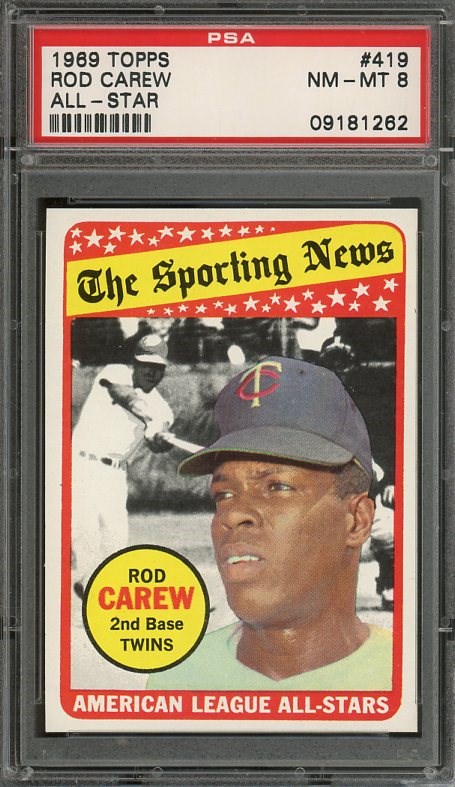 1969 Topps Rod Carew All-Star #419 PSA NM/MT 8 - Sharp corners and near perfect registration highlight this high end PSA 8. An eighteen time All-Star, Carew finished with a .328 lifetime average.