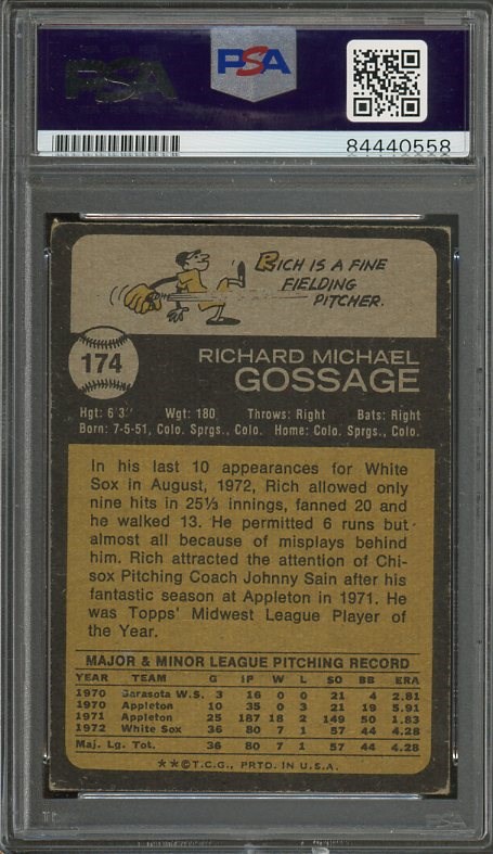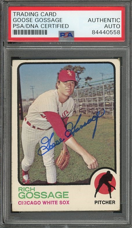 1973 Topps Rich "Goose" Gossage RC #174 Autographed PSA/DNA Authentic - A beautiful signature by Gossage where you can read every letter in his name. Card has corner wear, but no creases.