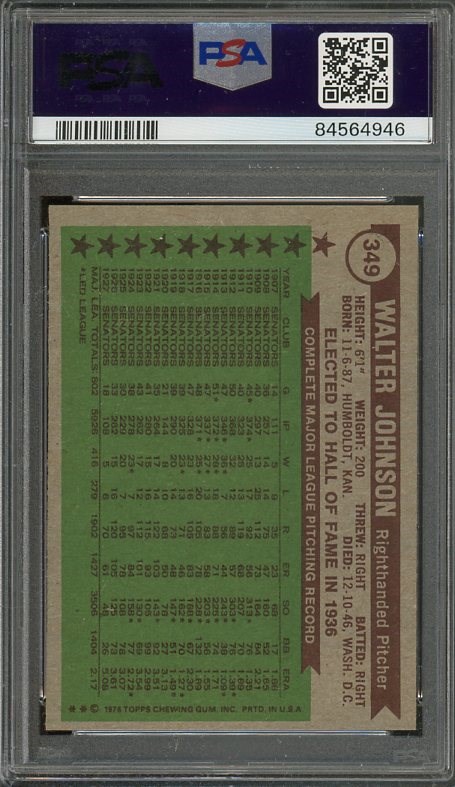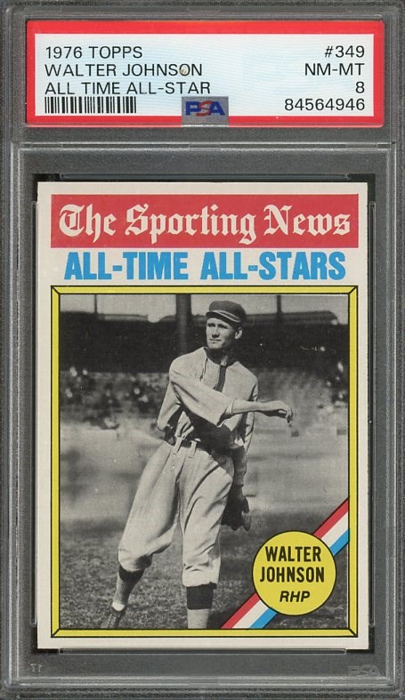 1976 Topps Walter Johnson #349 PSA NM/MT 8 - A high grade card in a new PSA holder. He remains by far the all-time career leader in shutouts with 110 and second in wins with 417
