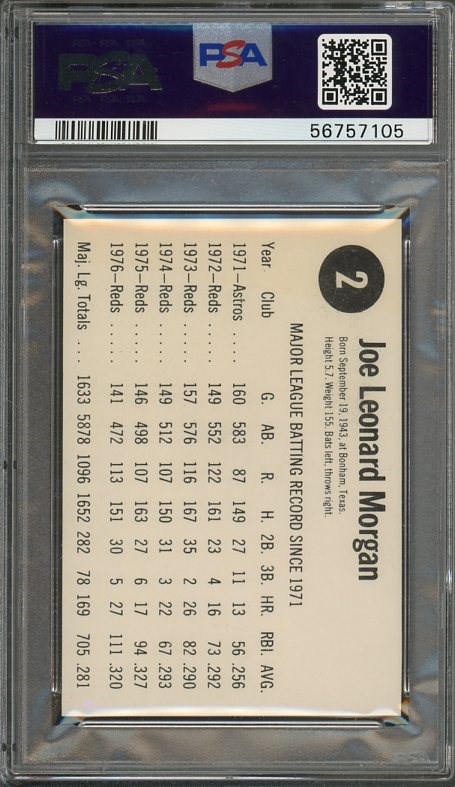 1977 Hostess Joe Morgan #2 PSA NM/MT 8 - Here is a Morgan card that you do not often see, this 1977 Hostess has great eye appeal and comes in a clean PSA holder.