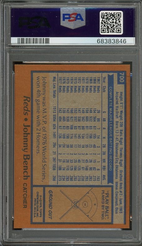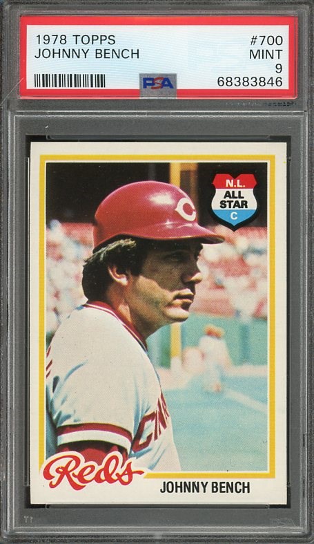 1978 Topps Johnny Bench #700 PSA MINT 9 - Bench arguably had the best decade ever for a catcher. During the decade of the 1970's, he was an all-star every year, won two MVP's and two World Series championships.