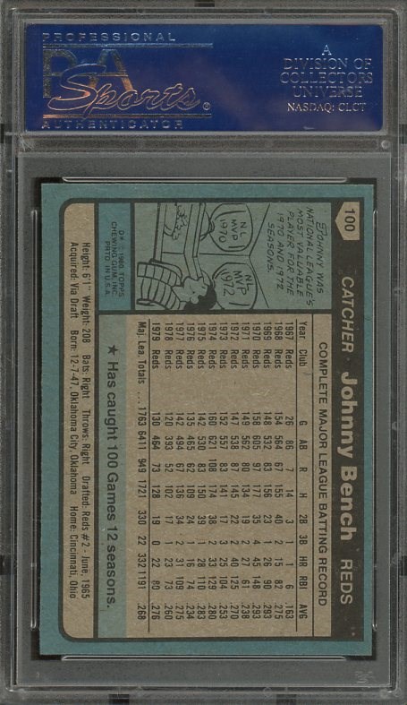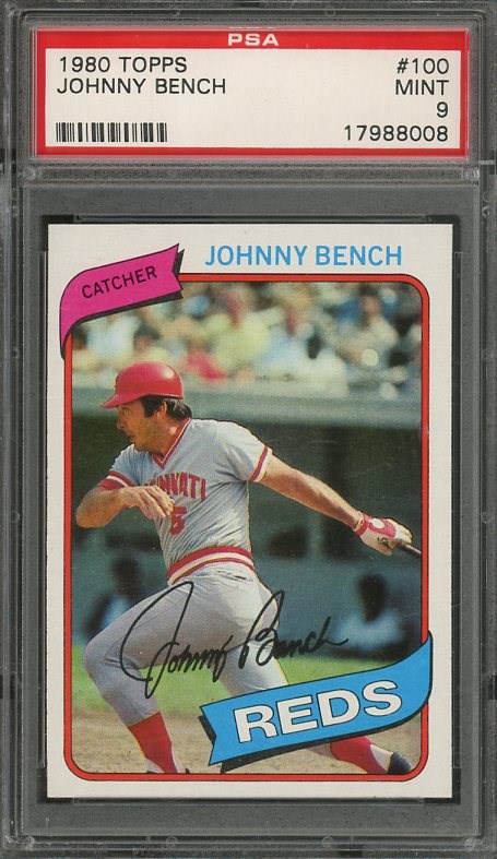 1980 Topps Johnny Bench #100 PSA MINT 9 - A very clean card with no issues or flaws. Card comes in a scratch free PSA holder.