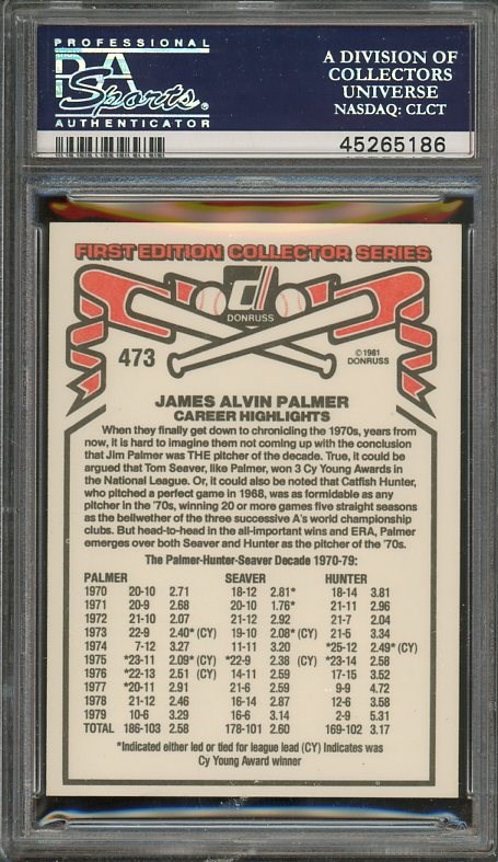1981 Donruss Jim Palmer #473  PSA GEM MINT 10 - Sharp and centered, the way a PSA 10 should be.  Card comes in a clean holder with no problems.