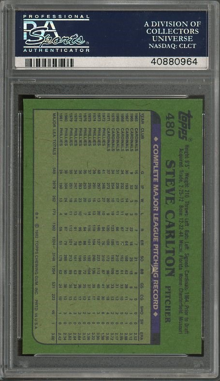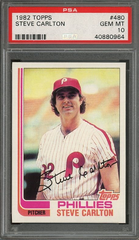 1982 Topps Steve Carlton #480 PSA GEM MINT 10 - Carlton held the all-time career strikeout record several times between 1982 and 1984, until Nolan Ryan surpassed him in late 1984.