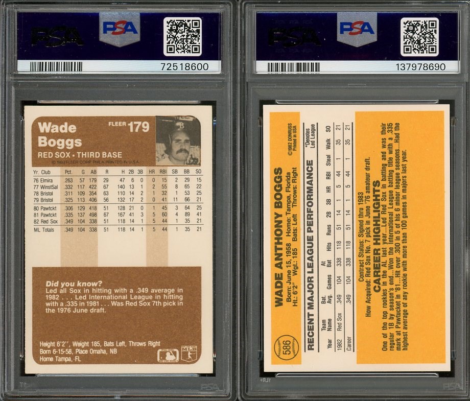 1983 Donruss #586 and Fleer #179 Wade Boggs RC's  Both are PSA MINT 9's - Get two Hall of Fame rookie cards in one lot!  Both cards are mint and come in problem free holders.
