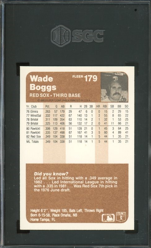 1983 Fleer Wade Boggs RC #179  SGC GEM MINT 10 - Recently graded by SGC, this Boggs rookie card is Gem Mint and ready to go into your collection.