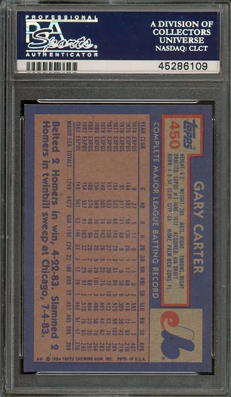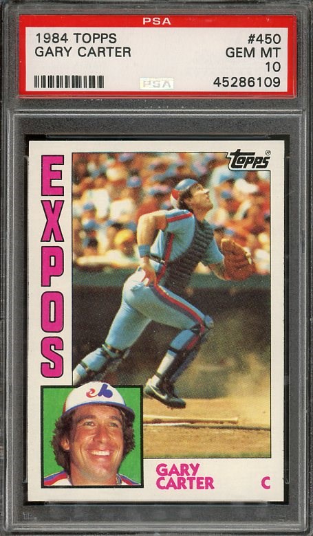 1984 Topps Gary Carter #450  PSA GEM MINT 10 - A clean PSA 10 with no issues.  Comes in a scratch free PSA holder.