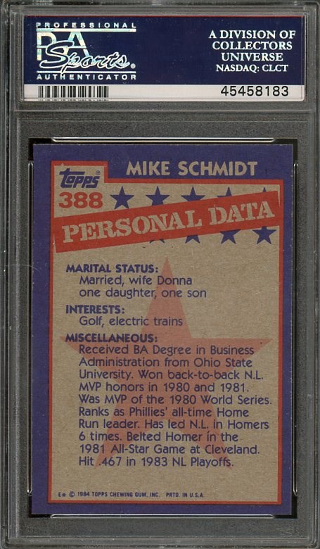 1984 Topps Mike Schmidt All-Star #388 PSA GEM MINT 10 - A sharp and centered card with great color. A nice item to add to your Hall of Fame collection.