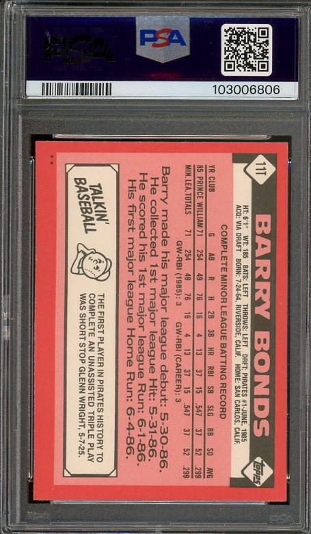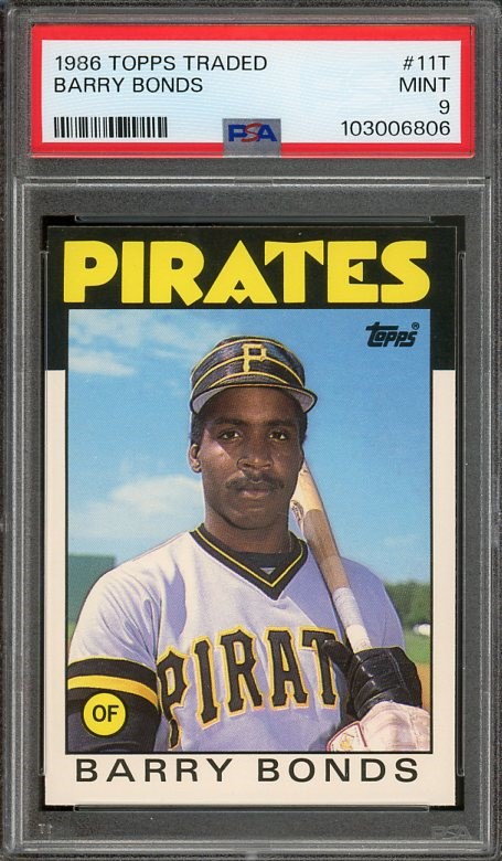 1986 Topps Traded Barry Bonds RC #11T PSA MINT 9 - There has been a revival in the Bonds market, as Barry's cards have surged in value over the last six months. Here is his first Topps issue in PSA 9 grade.