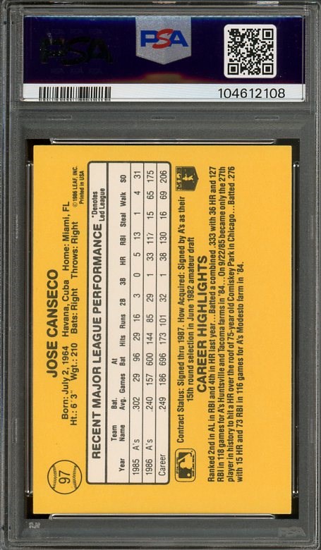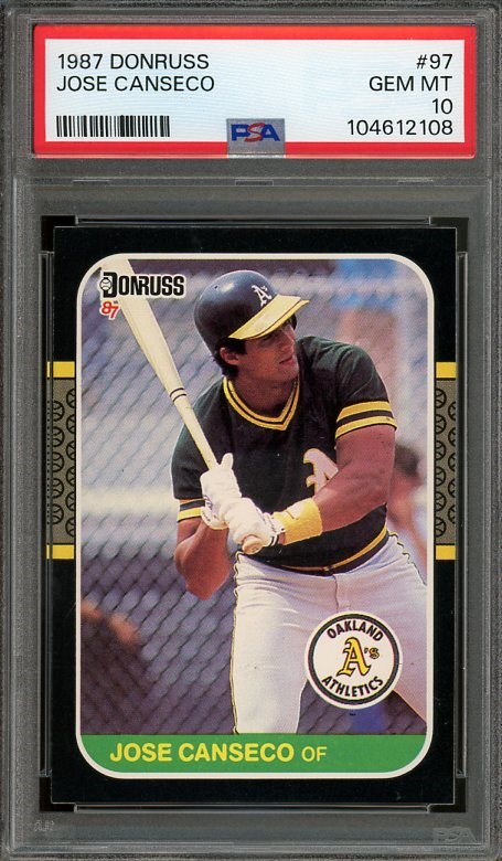 1987 Donruss Jose Canseco #97  PSA GEM MINT 10 - This is a tougher card than a lot of collector's think.  If you are a Canseco fan, this is a must have card!