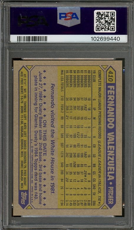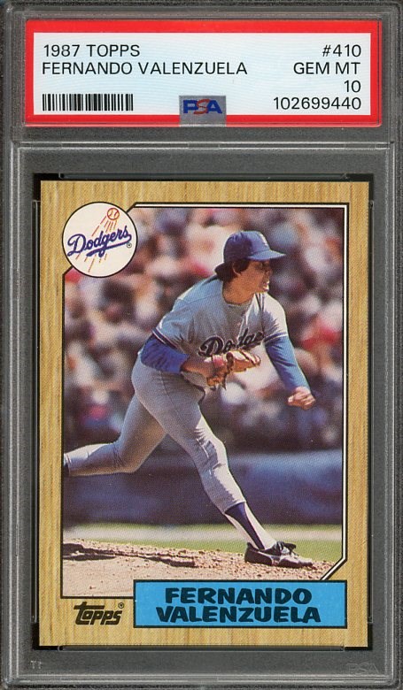 1987 Topps Fernando Valenzuela #410 PSA GEM MINT 10 - After Valenzuela's passing in 2024, collector's have taken renewed interest in his cards. Several of his issues have doubled in price in the last year.