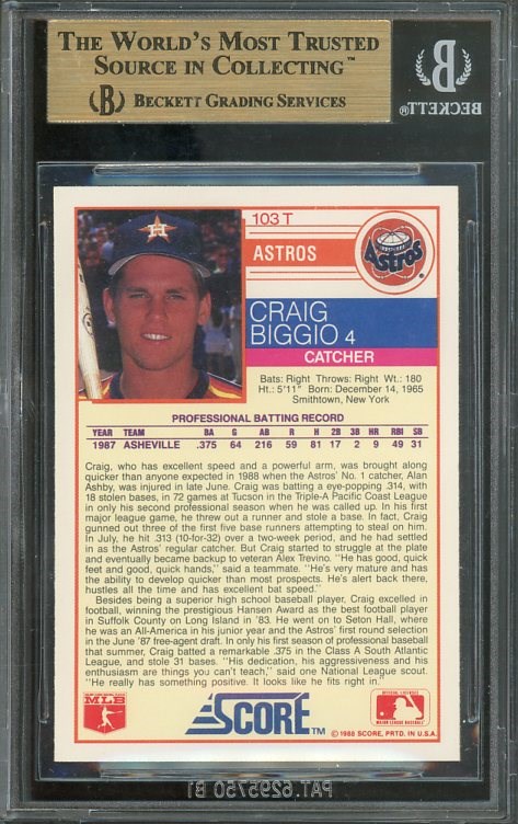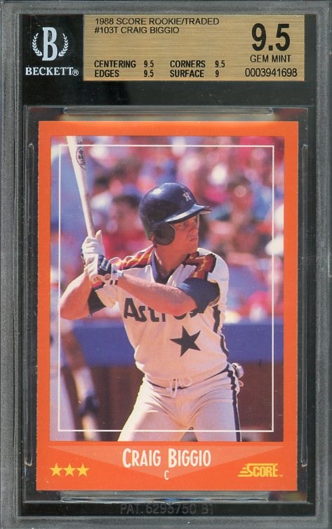 1988 Score Traded Craig Biggio RC #103T BGS Gem Mint 9.5 - Graded Gem Mint by Beckett, this is Biggio's best rookie card and a must have for collector's of HOF RC's.