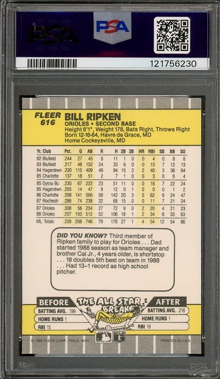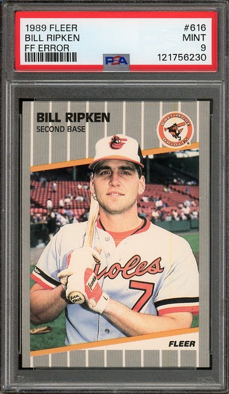1989 Fleer Billy Ripken "FF" Error RC #616 PSA MINT 9 - The popularity of this card keeps rising, and so have the prices that this card has been selling for in the market. Here is a high grade example that will get much attention.