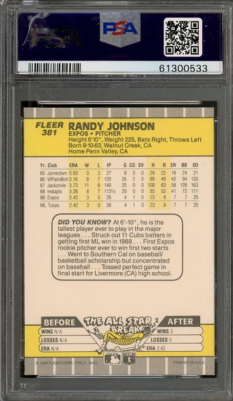 1989 Fleer Randy Johnson RC #381 (Ad Blocked Out) PSA GEM MINT 10 - This is the "Ad Blacked Out" version of the Randy Johnson Fleer rookie. Card is graded a PSA Gem Mint 10.