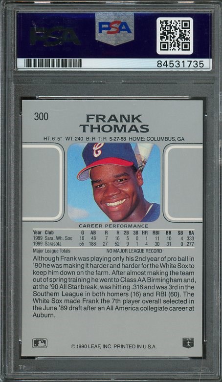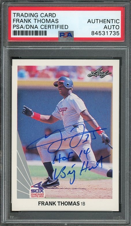 1990 Leaf Frank Thomas RC #300 Autographed with Inscriptions PSA/DNA - This is Thomas' best rookie card and he signed it with the "HOF '14" and "Big Hurt" inscriptions. PSA Authenticated.