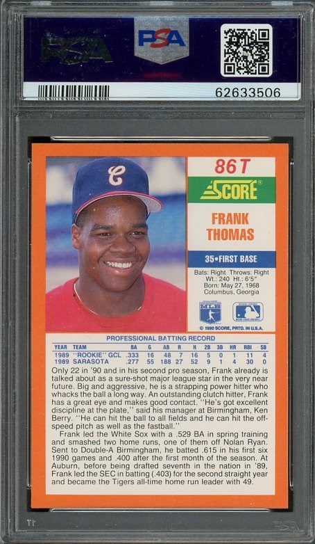 1990 Score Traded Frank Thomas RC #86T PSA GEM MINT 10 - This is one of the lower population PSA 10 rookies of Frank Thomas. Card and PSA holder are problem free.