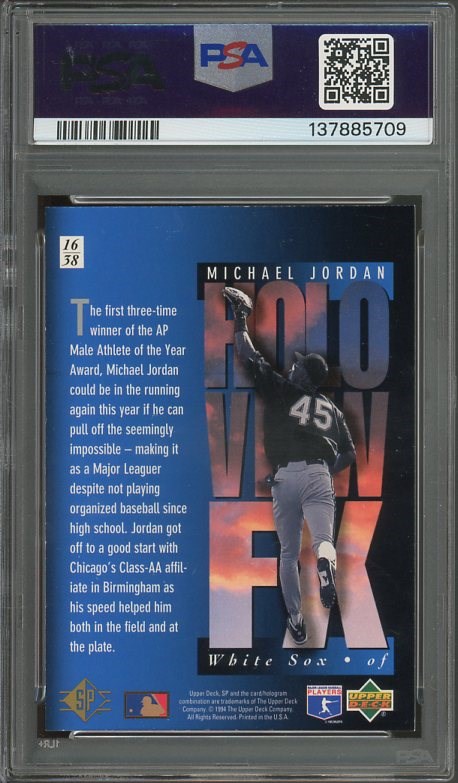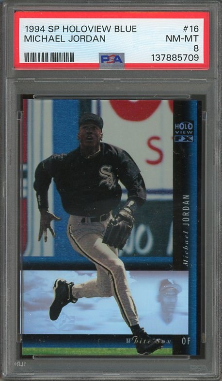 1994 SP Blue Holoview Michael Jordan #16 PSA NM/MT 8 - One of the tougher baseball cards of Jordan, this Blue Holoview is graded NM/MT 8 by PSA.